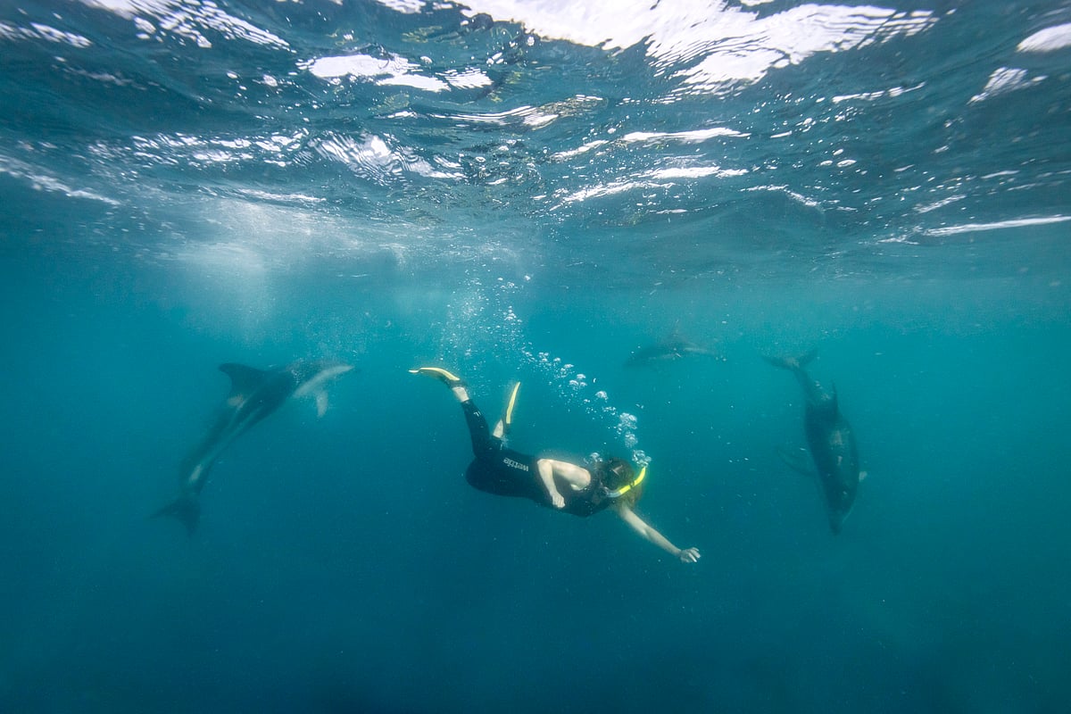 The marine capital of New Zealand is without a doubt Kaikoura, where visitors get to see whales, dolphins, seals, and seabirds just minutes from the coast. Visitors get the chance to indulge in one of nature's most unique experiences at Dolphin Encounter Kaikoura, swimming with or simply admiring the highly acrobatic dusky dolphins. These small black dolphins with a white belly inhabit the waters around Kaikōura all year-round with the pod sizes varying from 100 – 1000 plus.