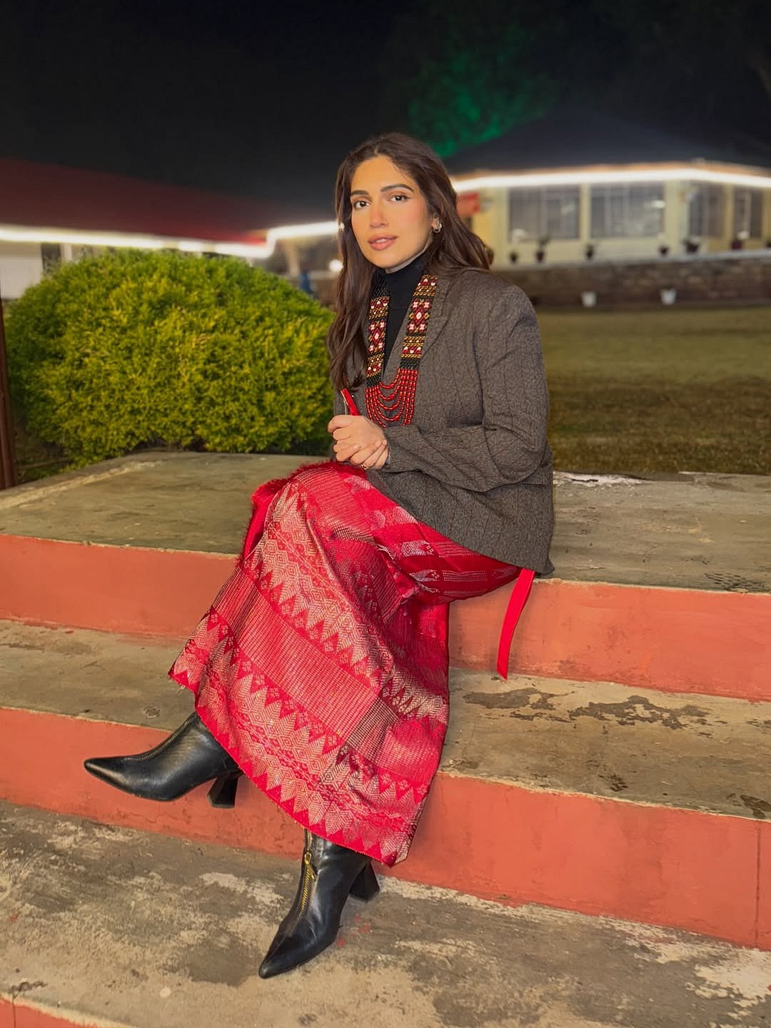 Accessorising with intention, Bhumi wore a traditional black embroidered necklace with white, yellow and red detailing, layered with red bead chains. Completed with a pair of black pointed-toe heeled boots.