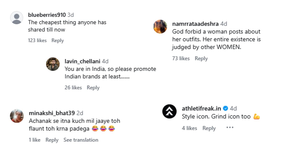 Another stated, "You are in India, so please promote Indian brands at least......." A third said, "Achanak se itna kuch mil jaaye toh flaunt toh krna padega."