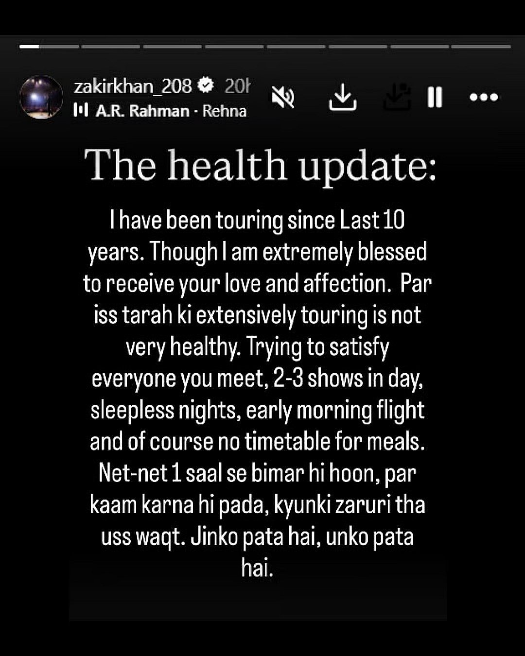 This is not the first time Zakir Khan has taken a break to look over his health, in September 2025, he took to social media to announce a short break. In his post he revealed that he had been facing illness due to extensive work hours, doing 2-3 shows in a day, sleepless nights & irregular meals.