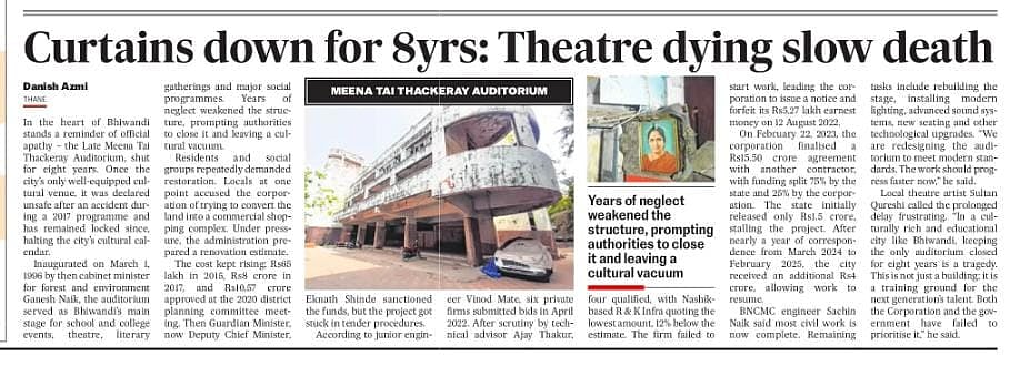 The auditorium has remained shut since 2017 after it was declared unsafe following an accident during a public function. Since then, Bhiwandi has been deprived of a dedicated cultural venue, affecting school programs, college events and community gatherings.