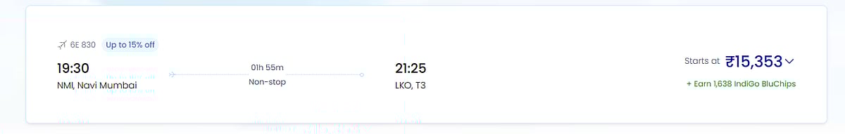 IndiGo will operate one daily flight from Lucknow. The flight will depart at 6.05 am and will reach NMI at 8.05 am. From NMI, the return flight will depart in the evening 17.30 PM and will reach Lucknow at 9.25 pm.