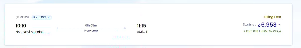 One daily flight from NMI will depart at 10.10 am and reach Ahmedabad at 11.15 am, while from Ahmedabad, the flight at 11.55 am and will reach NMI at 1 pm.