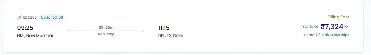 According to the IndiGo Website, one direct flight will operate to Delhi everyday. The flight will depart from NMI at 9.25 am and will reach Delhi at 11.25 am. While from Delhi, the flight will depart at 6.40 am and will reach NMI at 8.45 am.