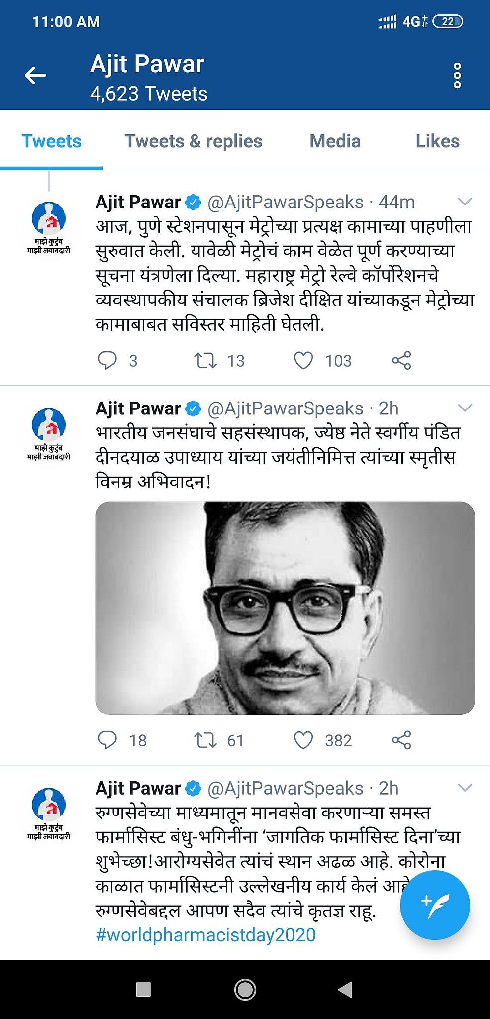 "Tributes to the founder of Jana Sangh and senior leader late Pandit Deendayal Upadhyaya on his birth anniversary," wrote Pawar. However, the tweet was deleted later.