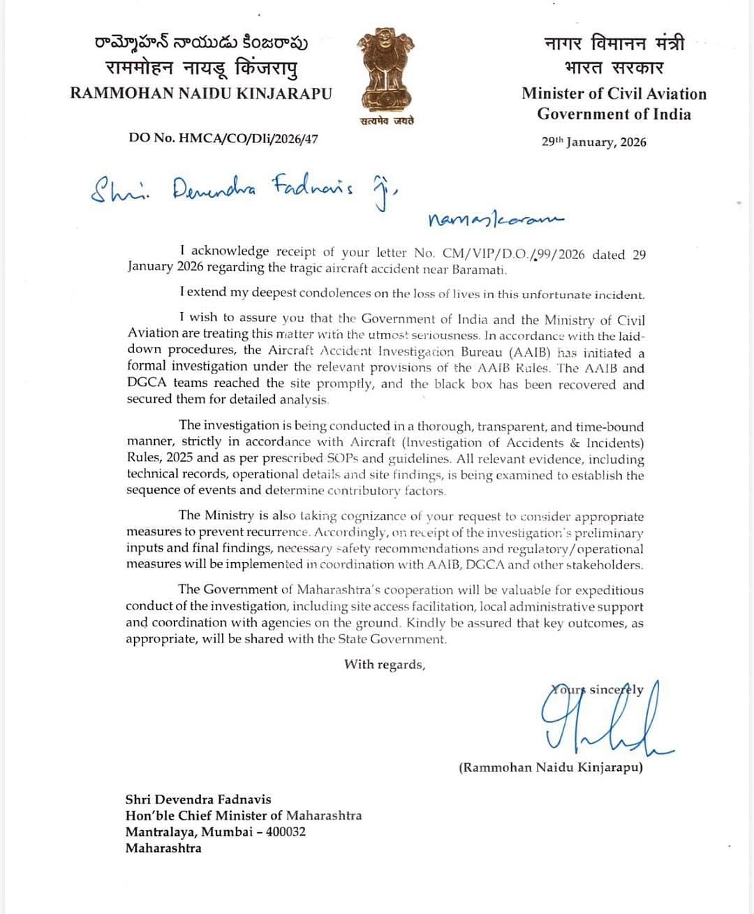The Union Ministry of Civil Aviation has confirmed that a formal investigation has begun into the tragic aircraft crash near Baramati, following concerns raised by Maharashtra Chief Minister Devendra Fadnavis. Civil Aviation Minister Ram Mohan Naidu, in an official letter dated January 29, assured the state government that the inquiry will be conducted with urgency, transparency and strict adherence to established aviation protocols.
