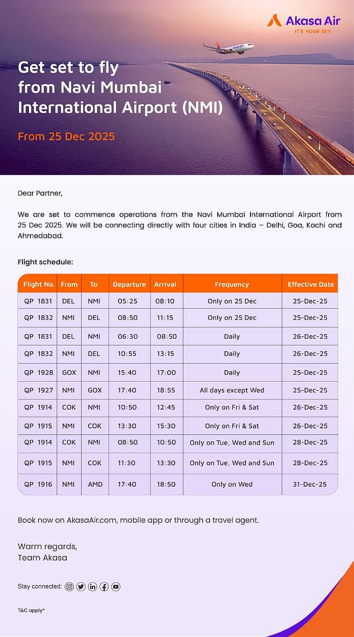 In an official communication to travel partners, the airline confirmed that the first set of flights will roll out on Christmas Day, followed by the start of regular daily and selective-day operations across several routes. The announcement positions Akasa Air among the earliest carriers to operate from NMI, highlighting its strategic focus on expanding connectivity in western India.