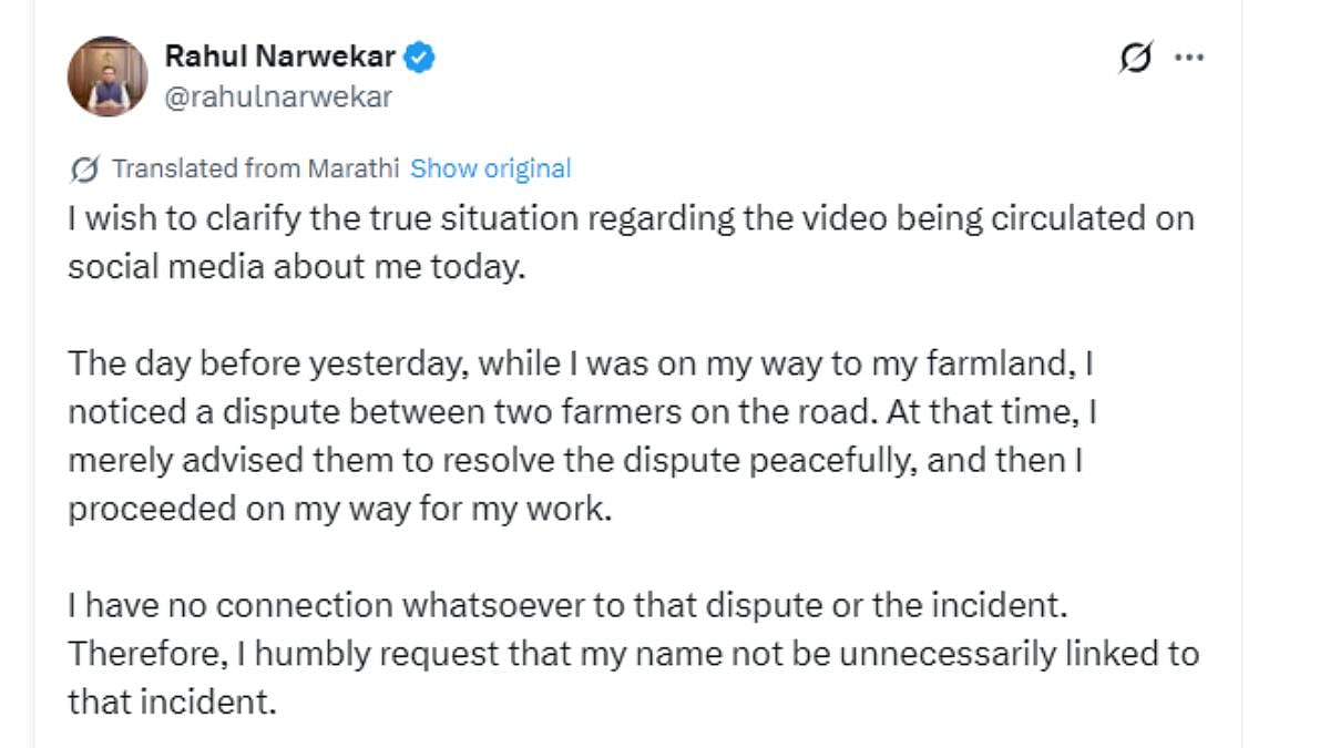 Hours after the video went viral, the Maharashtra Legislative Assembly Speaker, Rahul Narwekar, issued a clarification that he had no connection to the dispute or the incident. In a post on X, he said, "While I was on my way to my farmland, I noticed a dispute between two farmers on the road. At that time, I merely advised them to resolve the dispute peacefully, and then I proceeded on my way for my work."