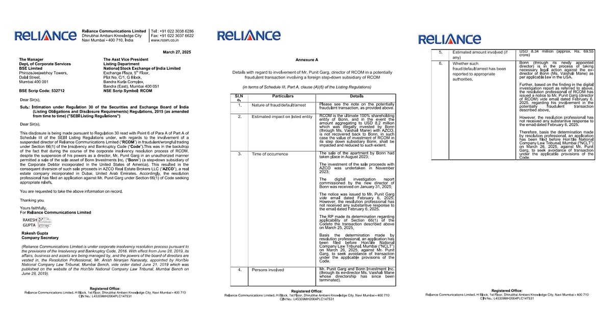 RCOM said no substantive response was received. “Based on the determination made by the resolution professional on March 25, 2025, an application has been filed before the Hon’ble NCLT, Mumbai, on March 26, 2025, seeking avoidance of the transaction and appropriate reliefs under the applicable provisions of the Code,” the filing stated.