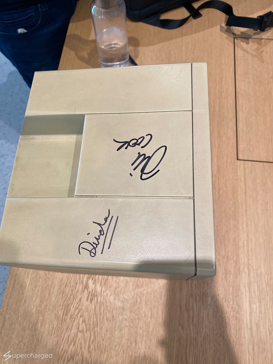 Tim Cook and Deirdre O'Brien sign on a Apple customers Macintosh SE