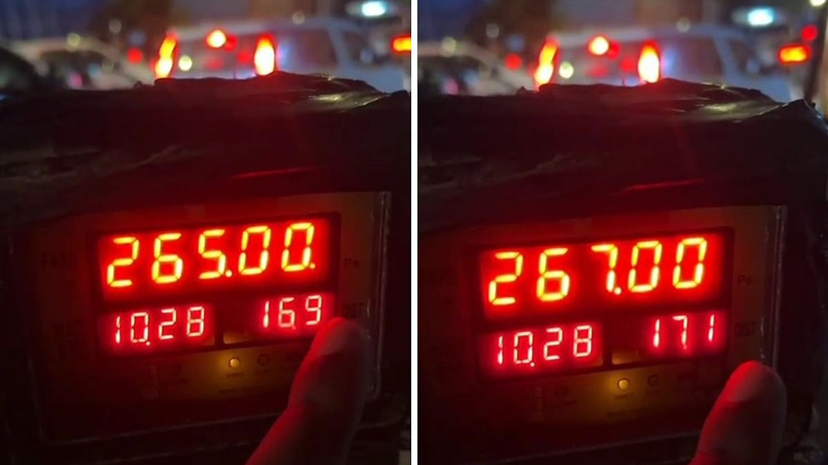 In the first image, the meter reads Rs 265, displaying two dots: one after 265 and another after the double zero. This suggests that the meter may have been tampered with, as the presence of two dots indicates potential manipulation.