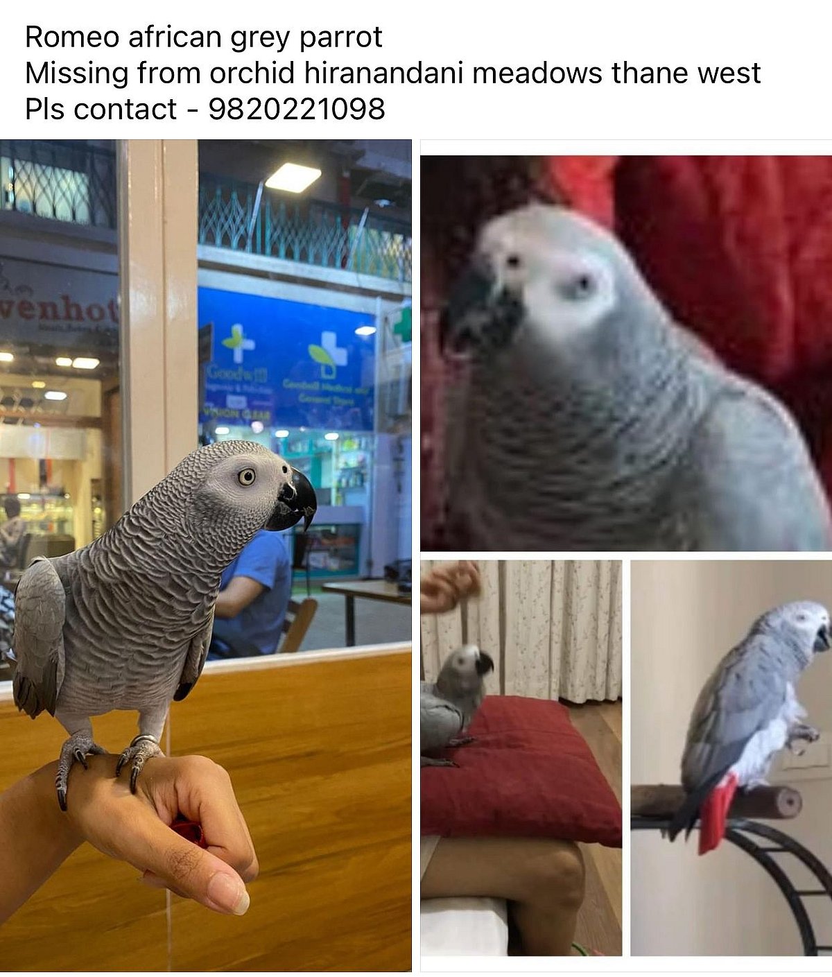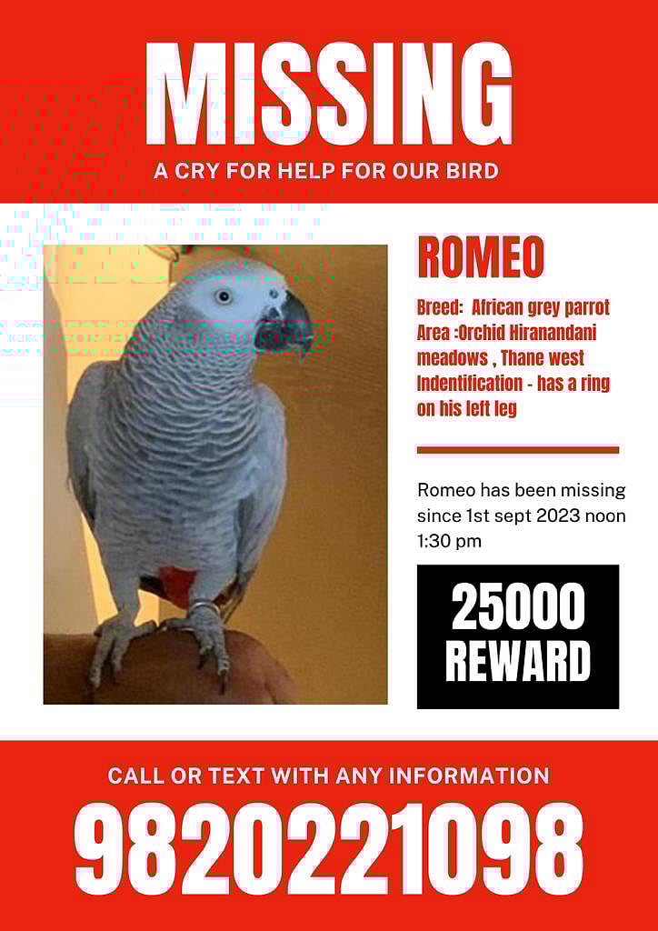 Thane: In a heart-wrenching tale, Shreyas Joshi and his wife, Seema Joshi, residents of Orchid Hiranandani Meadows in Thane, are enduring the anguish of their 8-year-old African grey parrot, Romeo, going missing since September 1. Romeo had been a cherished member of their family since he came to live with them when he was just two months old.