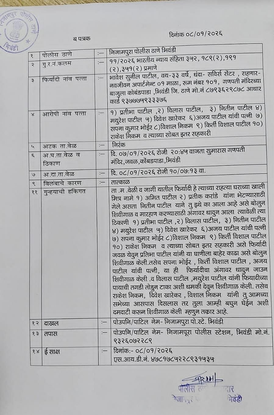 She also accused the police of acting under pressure from the ruling party. With civic polls approaching, the twin FIRs have turned Ward No.1 into a political flashpoint, raising serious concerns about law and order and the safety of women during election campaigning in Bhiwandi.