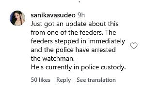However, as per a user's comment on the post, the accused watchman was arrested after local feeders and animal lovers stepped into the matter and remains in police custody. "Just got an update about this from one of the feeders. The feeders stepped in immediately and the police have arrested the watchman. He's currently in police custody," wrote a user in a comment on the post.