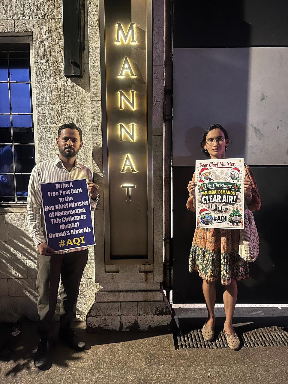"The citizen action called attention to rising air quality index (AQI) levels and the urgent need for strict enforcement against construction dust, waste burning, and polluting activities, said activist Furkan Shaikh said standing with the placards. "This Christmas, while Mumbai celebrates, the city is struggling to breathe. Clean air is not a luxury or a festival promise — it is a fundamental right, and the government must act now.”
