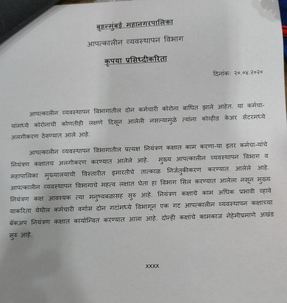 On Monday, two staff members of the Brihanmumbai Municipal Corporation's (BMC) 24/7 disaster management control room have tested positive for COVID-19, the Corporation said in a letter.