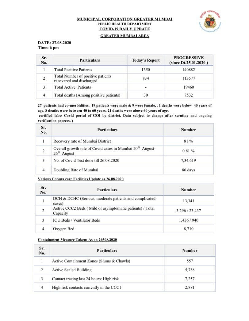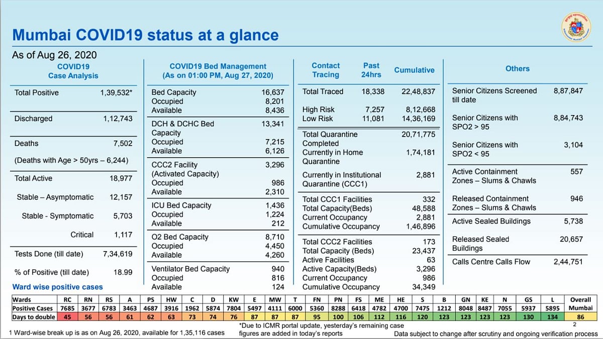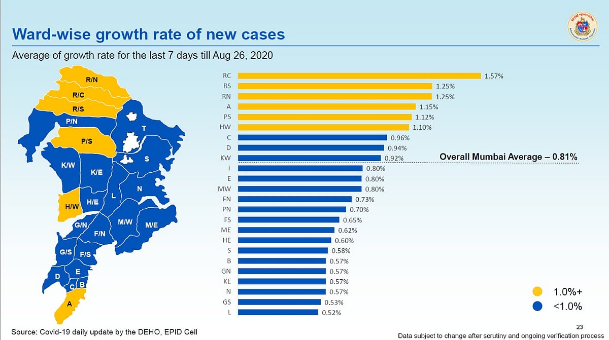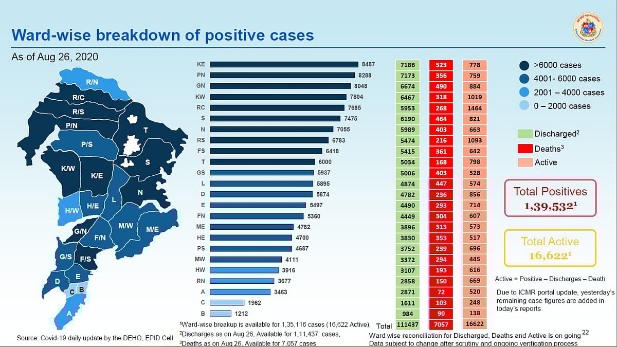 The BMC has also issued a ward-wise breakdown of positive cases as of August 26, as well as a ward-wise growth rate of new cases.