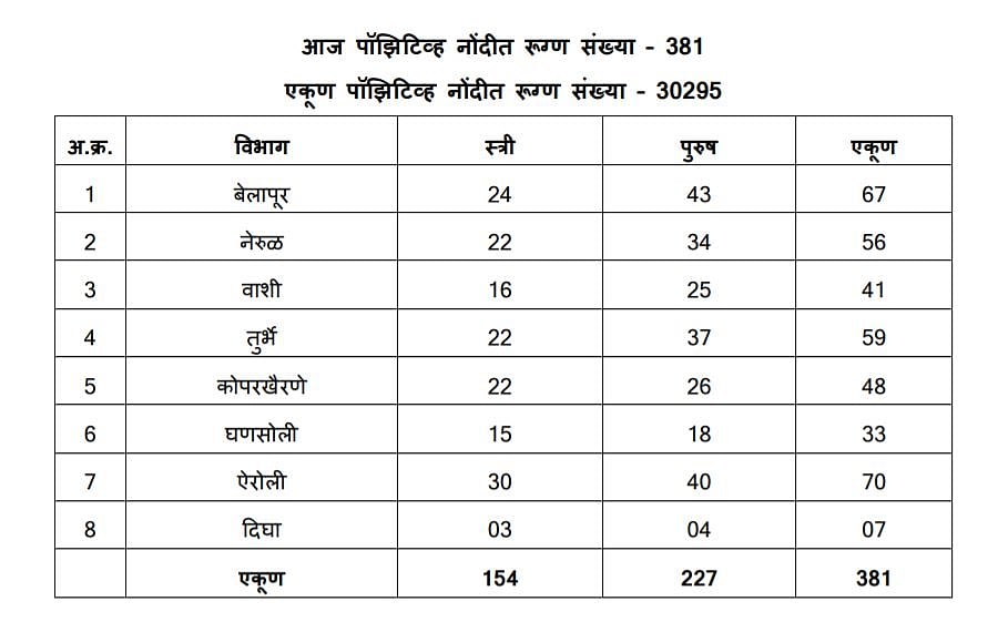 As COVID-19 cases continue to rise, the Navi Mumbai Municipal Corporation said on Tuesday that as of September 12, it has recorded a total of 30295 positive cases. At the same time, six more people passed away, pushing the death toll to 656.