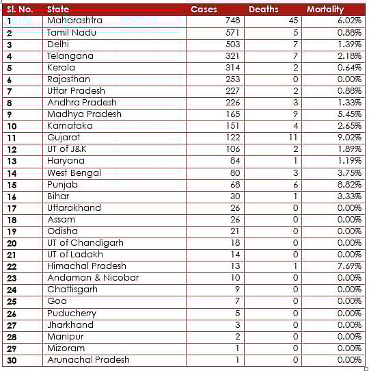 Maharashtra stands first with 748 cases, while Tamil Nadu and Delhi are close with 571 and 503 cases respectively. Gujarat stands top with a mortality rate of 9.02%, followed by Punjab, Himachal Pradesh, Maharashtra and Madhya Pradesh. All the states have at least one COVID-19 positive case registered, though there aren’t any deaths registered in over 13 states. Maharashtra accounts for 41% of the death toll, followed by Gujarat at 10%.