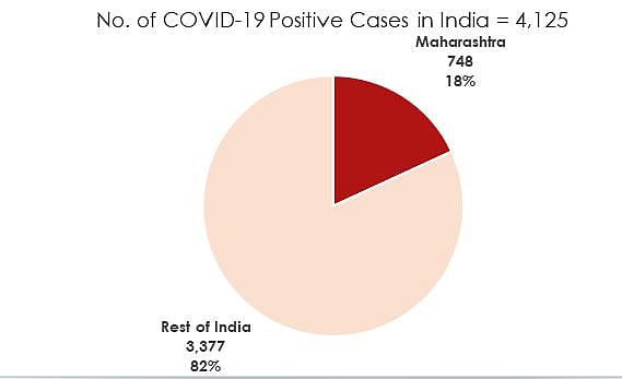India registered its first COVID-19 Positive case on February 1, 2020, and the numbers have been flat till the end of the month, owing to no testing being done. The first notable increase was on the 3 March 2020, when 23 new cases have been registered, and since then an average of over 100 new cases have been added each day, reaching 4,125 positive cases. Maharashtra registered its first case on 9 March 2020, 37 days after the first case in the country, and since then an average of 25 new cases have been added each day, bringing the total to 748.