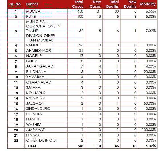 The state accounts for 18.13% of India’s total COVID-19 positive cases, and 41.28% deaths, with an alarmingly higher mortality rate than the national and global rate, at 6.02%. The death toll reached 45 in the state today, with the addition of 13 new deaths. 110 new cases for registered, bringing the total number of cases to 748.