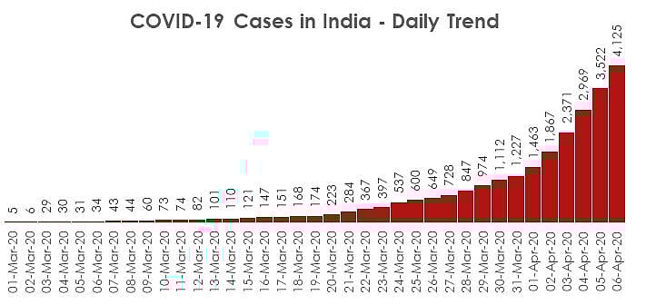 India registered its first notable increase in COVID-19 positive cases on 3 March 2020, when 29 new cases were registered in a single day, bringing in the total to 29. In the last 10 days, a total of 3,397 cases have been registered, bringing the total cases in India to 4,125.