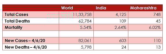 The number of COVID-19 positive cases have reached 1,133,758 across the globe on 6th April 2020, with the addition of 82,061 new cases. In India, the number has reached 4,125 cases, with the addition of 603 cases today. Mortality rate for the World is 5.54%, while India is at 2.64%. Globally there are 5.798 deaths today, while India registered 24 deaths.