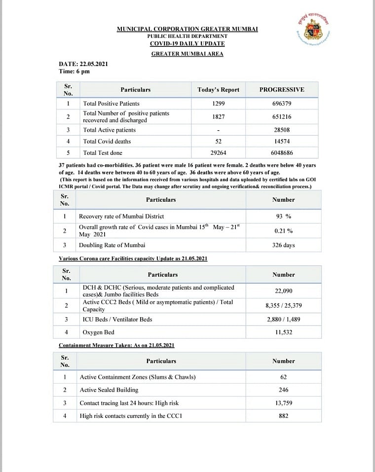With the addition of 1,299 new COVID-19 cases on May 22, Mumbai's infection tally rose to 6,96,379. Now, there are 28,508 active cases in the city.
