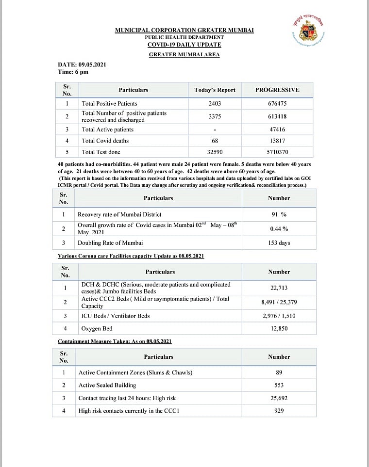 With the addition of 2,403 new COVID-19 cases on May 9, Mumbai's infection tally rose to 6,74,072. Now, there are 47,416 active cases in the city. This is the lowest single day spike since March 30.
