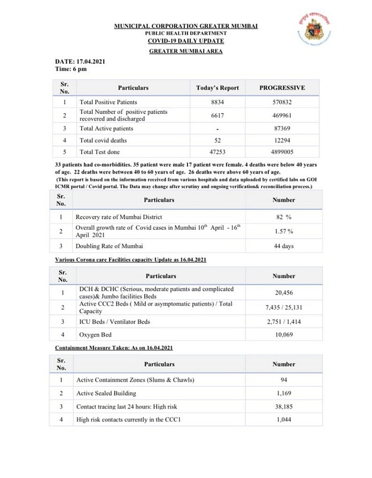Mumbai on Friday reported 8,834 fresh COVID-19 cases and 52 deaths, as per a report by BMC's health department.