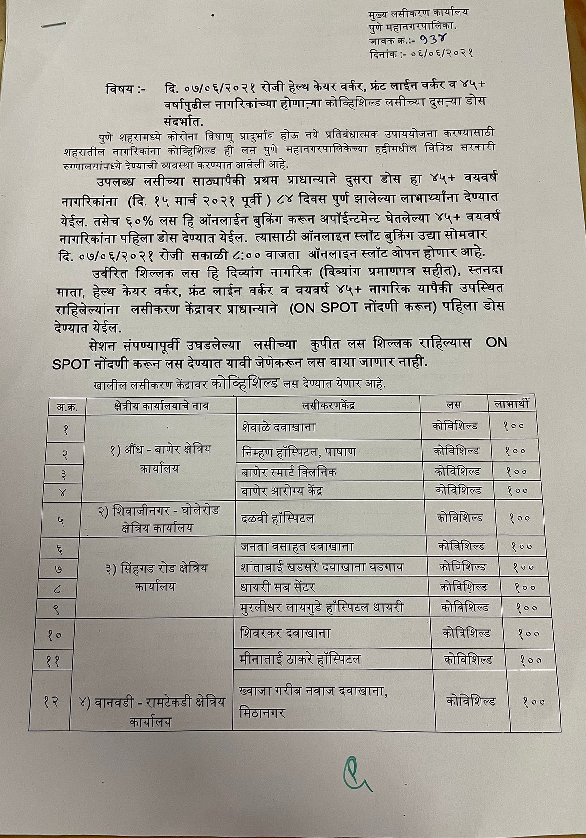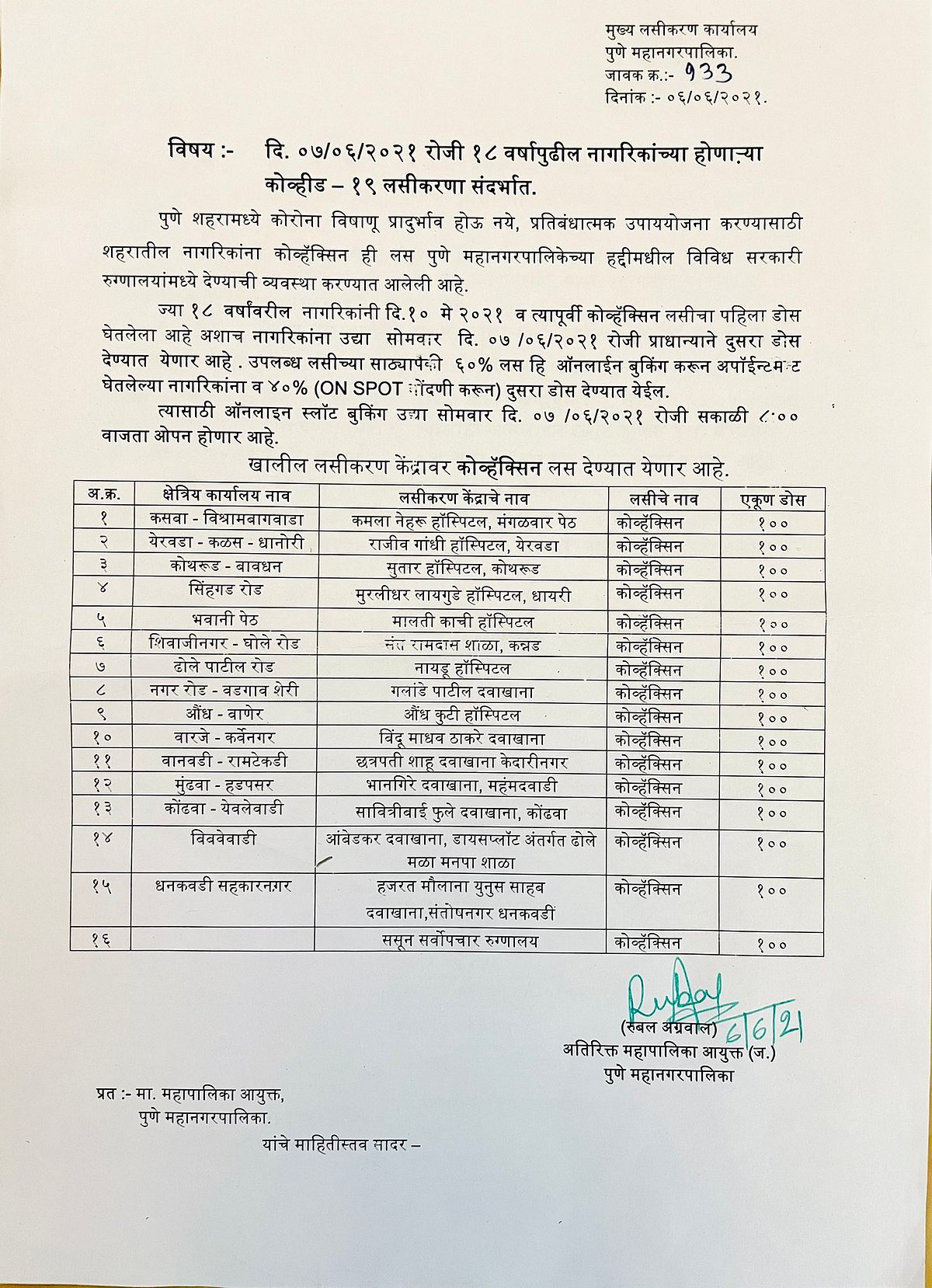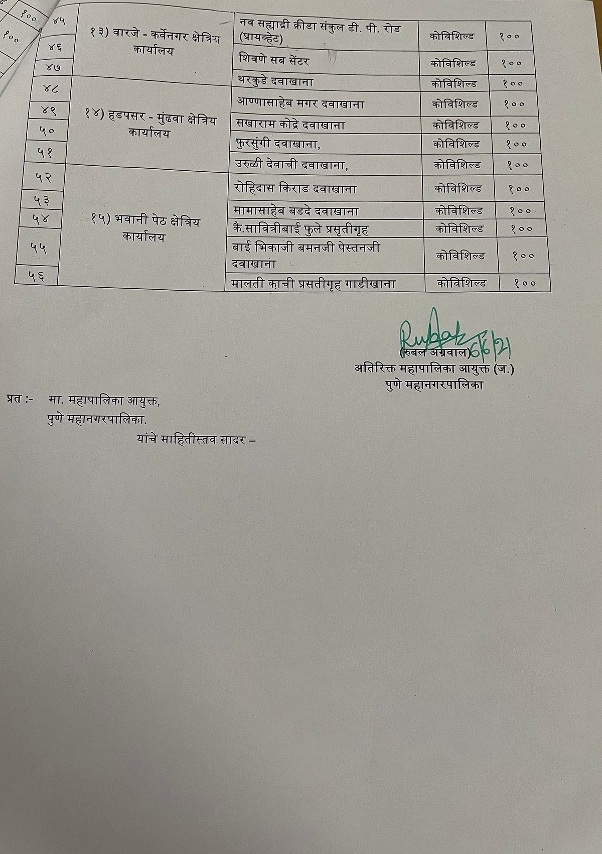 Rubal Agarwal, Additional Municipal Commissioner of Pune Municipal Corporation (PMC), on Sunday released a list of COVID-19 vaccination centres that will remain open on Monday (June 7).