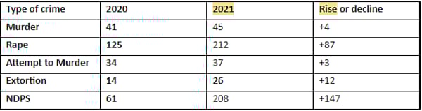 While briefing to media, police commissioner Bipin Kumar Singh said that the crime rates had dipped during 2020 as there was lockdown round the year. However, during 2021, with the opening a number of services, people stepped out of their homes and crime rates started rising. “It will be fair to compare crime rates of year 2021 with year 2019, instead of 2020 to know the exact situation,” said Singh. The police did not provide the exact difference in crime rates between 2021 and 2020.