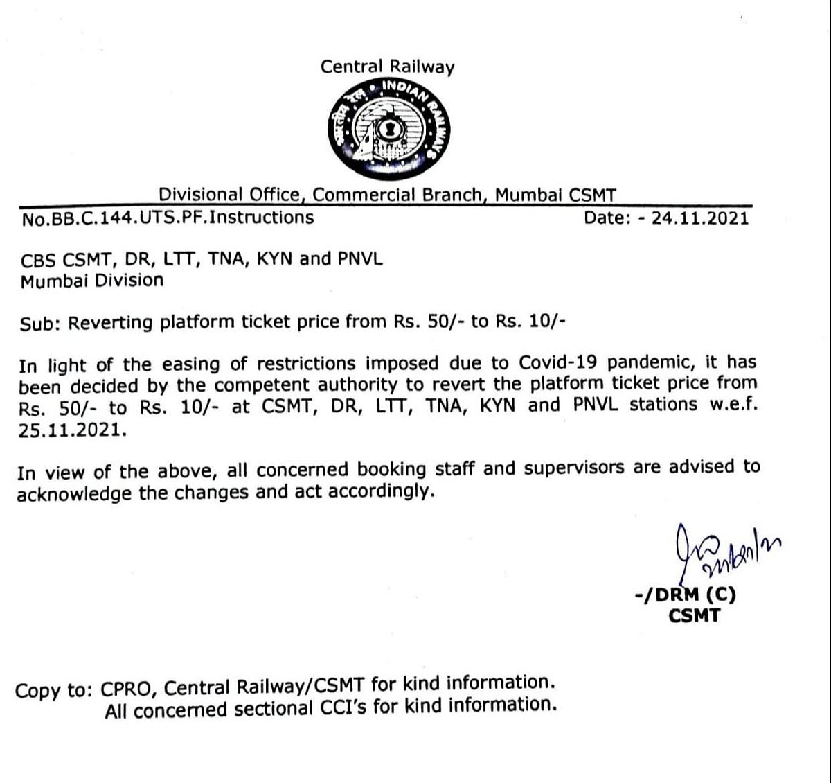 "In light of the easing of restrictions imposed due to the COVID-19 pandemic, it has been decided by the competent authority to revert the platform ticket price from Rs 50 to Rs 10 at CSMT, DR, LTT, TNA, KYN and PNVL stations w.e.f 25.11.2021," read the Central Railway notification.