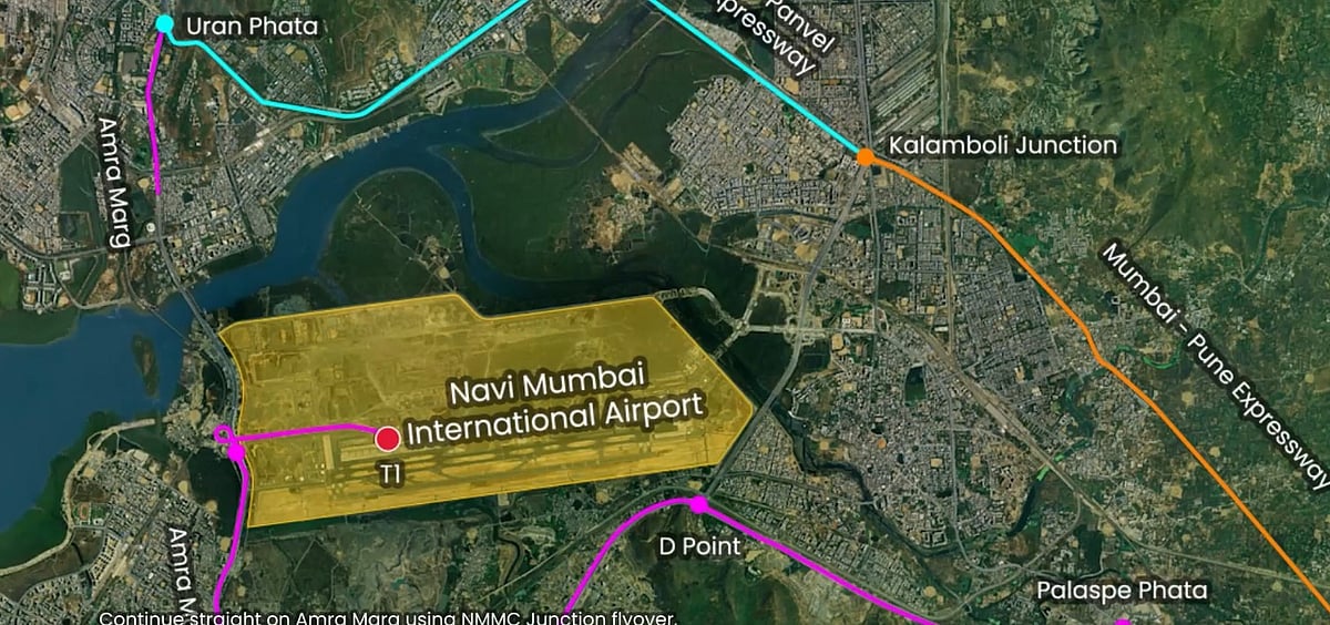 After crossing Palaspe, drivers should continue straight until they reach the Gavhan Fata interchange. At this point, a right turning loop leads vehicles onto Amra Marg, the main arterial road providing access to the airport precinct.