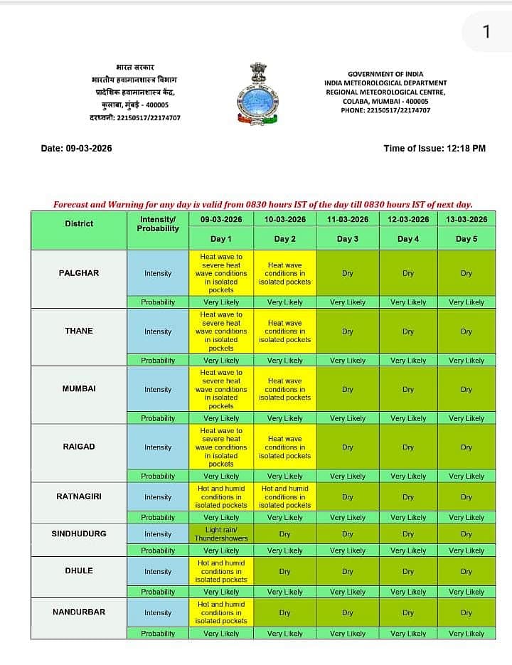 Thane: The India Meteorological Department (IMD) has issued a critical weather warning for Thane and surrounding districts, forecasting "heat wave to severe heat wave conditions" in isolated pockets. According to the latest bulletin issued on March 9, 2026, these extreme conditions are "very likely" to persist through today and tomorrow, March 10.