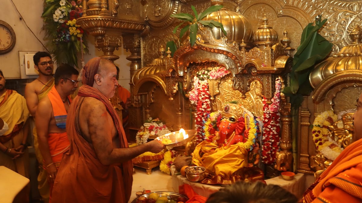 Mumbai: Sankaracharya Vijayendra Saraswati Swamigal, who is visiting Mumbai for the the first time after he became the peethadhipathi of the Kanchi Kamakoti Peetham, prayed at the Shree Siddhivinayak Ganpati temple, Prabhadevi, on Friday morning.