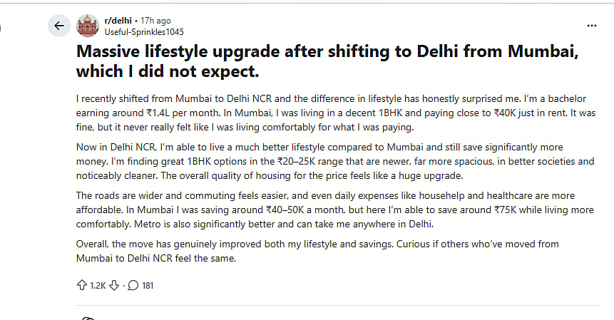 "I recently shifted from Mumbai to Delhi NCR, and the difference in lifestyle has honestly surprised me. I’m a bachelor earning around Rs1.4L per month. In Mumbai, I was living in a decent 1BHK and paying close to Rs. 40K just in rent. It was fine, but it never really felt like I was living comfortably for what I was paying," he shared on the post.