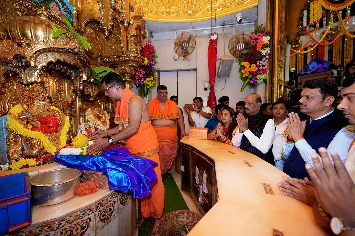 Mumbai: Chief Minister of Maharashtra, Devendra Fadnavis, visited the Shree Siddhivinayak Ganapati Temple on Thursday to offer prayers. He was welcomed by the chairman of the temple trust, Sadanand Sarvankar, who presented him with an idol of Lord Ganesha.