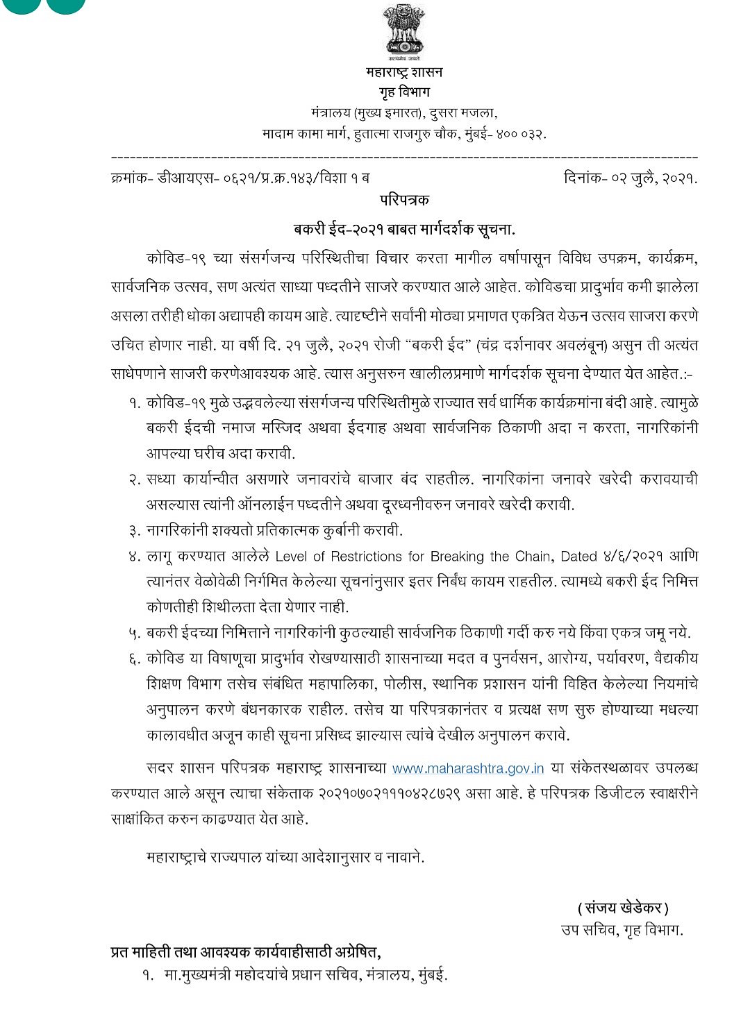 There will be no relaxation in restrictions for Eid as stated in the 'Break the Chain' order by the state government, and people are directed not to congregate in public places on the day of the festival, it added.