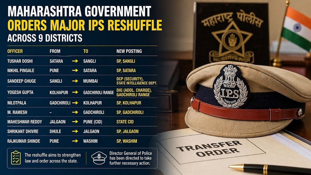Mumbai, April 20: The Maharashtra government has ordered a major reshuffle in the police administration across nine districts, transferring several senior IPS officers. The move is expected to bring significant administrative changes in key districts such as Satara, Sangli, Gadchiroli, Kolhapur, and Jalgaon.