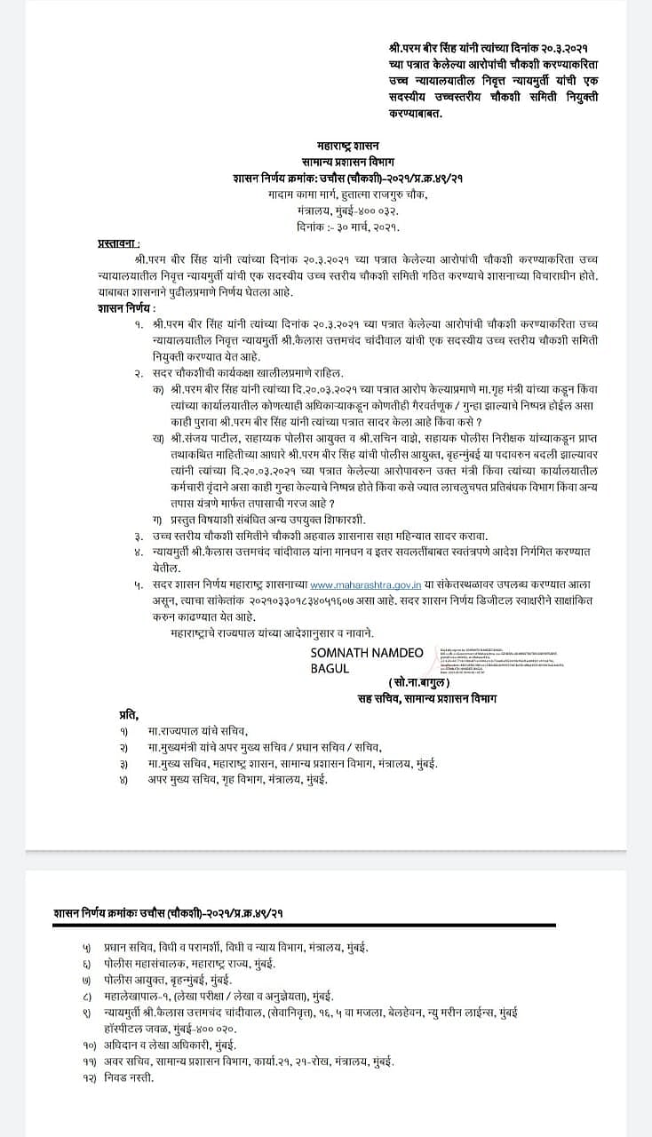 However, the one-member panel will inquire into corruption charges made by Singh in his letter dated March 20, 2021, addressed to Chief Minister Uddhav Thackeray. Singh had alleged that Deshmukh had told Sachin Vaze, who has been arrested by the National Investigation Agency (NIA) in connection with the Mukesh Ambani threat case, that he had a target of collecting Rs 100 crore a month from bars, restaurants and other establishments. The committee will probe whether such a demand was made by Deshmukh or his office staff and whether Singh had submitted evidence against the Home Minister and his staff along with his letter.