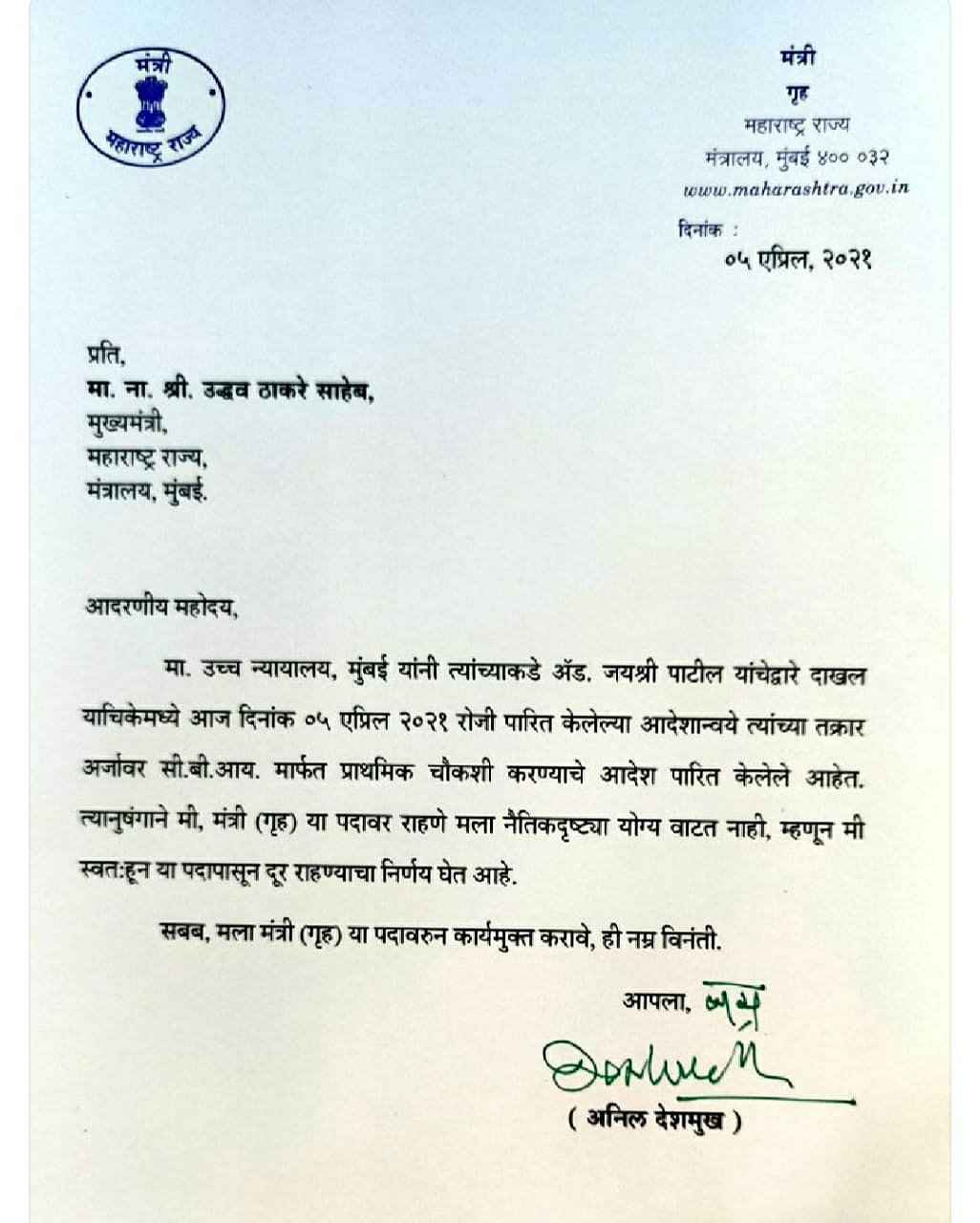 Maharashtra home minister Anil Deshmukh has resigned after HC ordered CBI to conduct a probe into corruption charges against him.