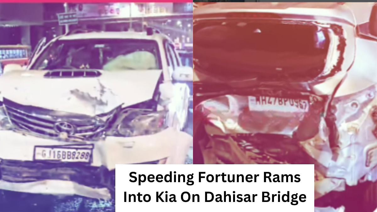 Mumbai: Passengers, including senior citizens, were injured after a speeding Fortuner lost control and rammed into a Kia car on Dahisar Bridge in Mumbai. The incident occurred on Saturday night when the Fortuner hit the Kia from behind. Visuals shared online showed the impact of the collision, with the Kia car seen badly damaged.