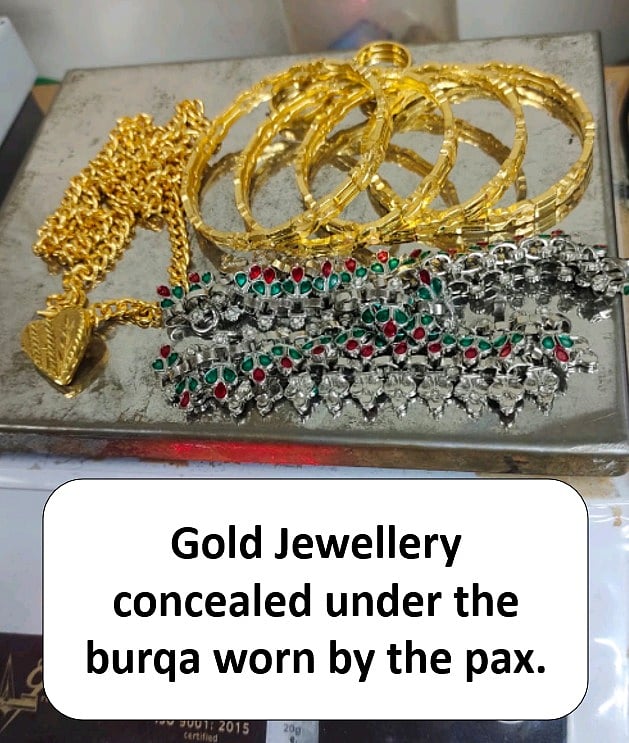 •Twenty-Two Indian Nationals travelling from Dubai (10), Abu Dhabi (03), Jeddah (01), Cairo (01), Doha (01), Hongkong (01), Kuala Lumpur (01), Kuwait (03) and Muscat (01) were intercepted and found carrying 8575 grams gold concealed, inside undergarments, under the burqa, in the pocket of Jeans, in the rectum and on the body of pax.