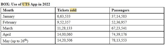 Since December 2021, the number of passengers using the UTS App to book their tickets rose by 56 per cent. According to officials from Central Railway, post-Covid-19, they are trying to provide thrust to digital and paperless booking through UTS mobile ticketing.