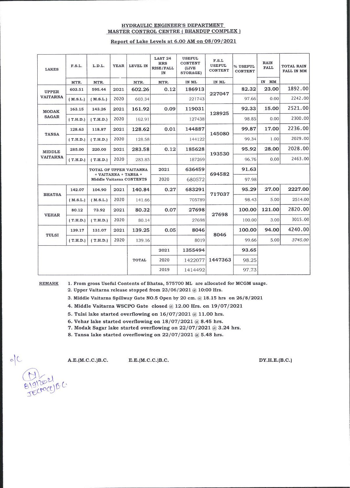 At Modak Sagar, 92.33% of water stock is available, Middle Vaitarna 95.92%, Upper Vaitarna has 82.32%, Bhatsa 95.29%, Vihar 100% and Tulsi has 100% of useful water level.