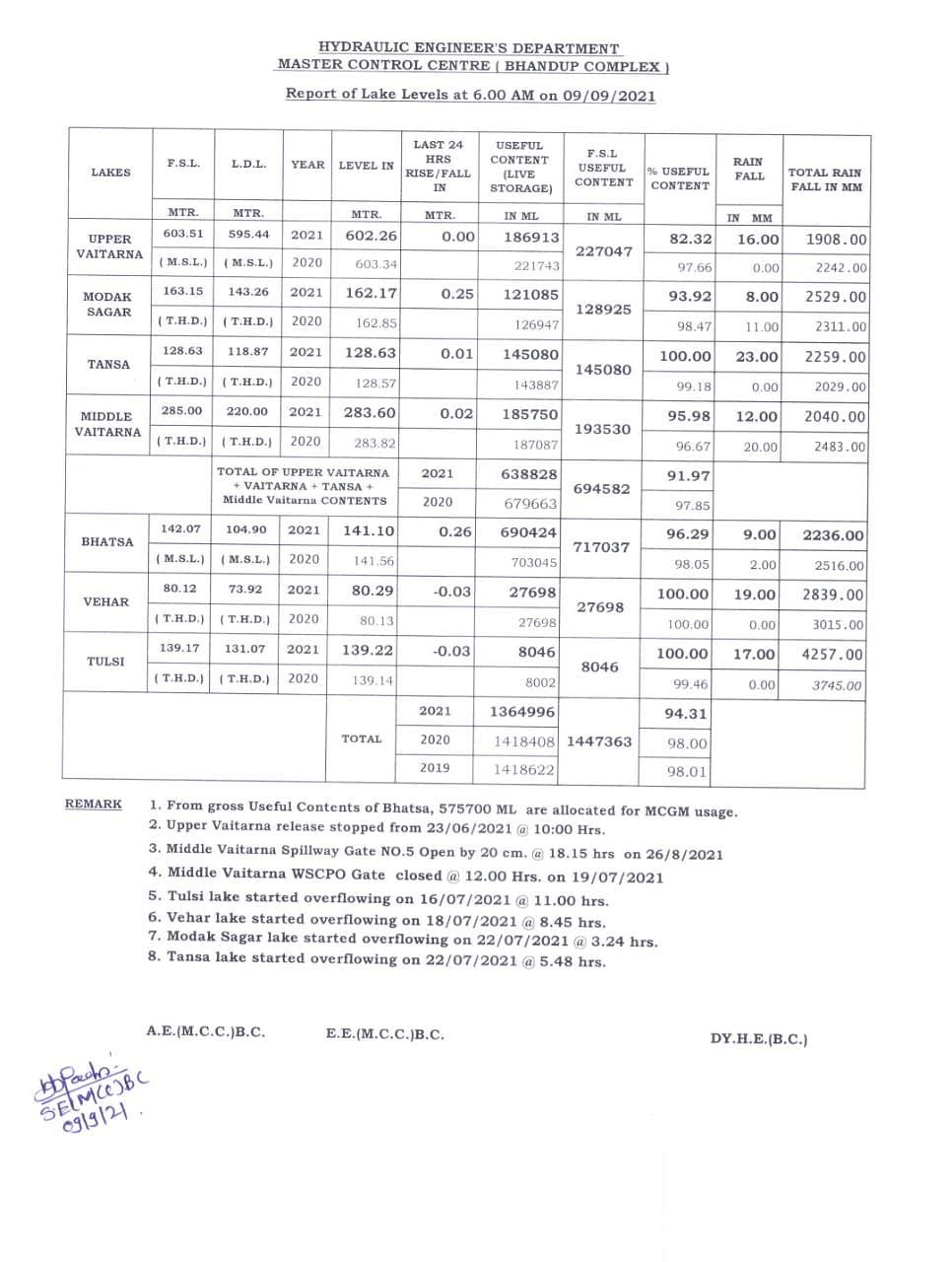 At Modak Sagar, 93.92% of water stock is available, Middle Vaitarna 95.98%, Upper Vaitarna has 82.32%, Bhatsa 96.29%, Vihar 100% and Tulsi has 100% of useful water level.