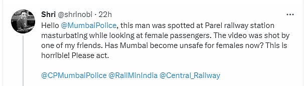 Tagging Mumbai police on Twitter along with the video of the man, she wrote: "I'd like to bring this to your notice, yesterday while returning home from work at Parel railway station a man was masturbating and the moment I could even think of calling the station police he caught the next local and went."
