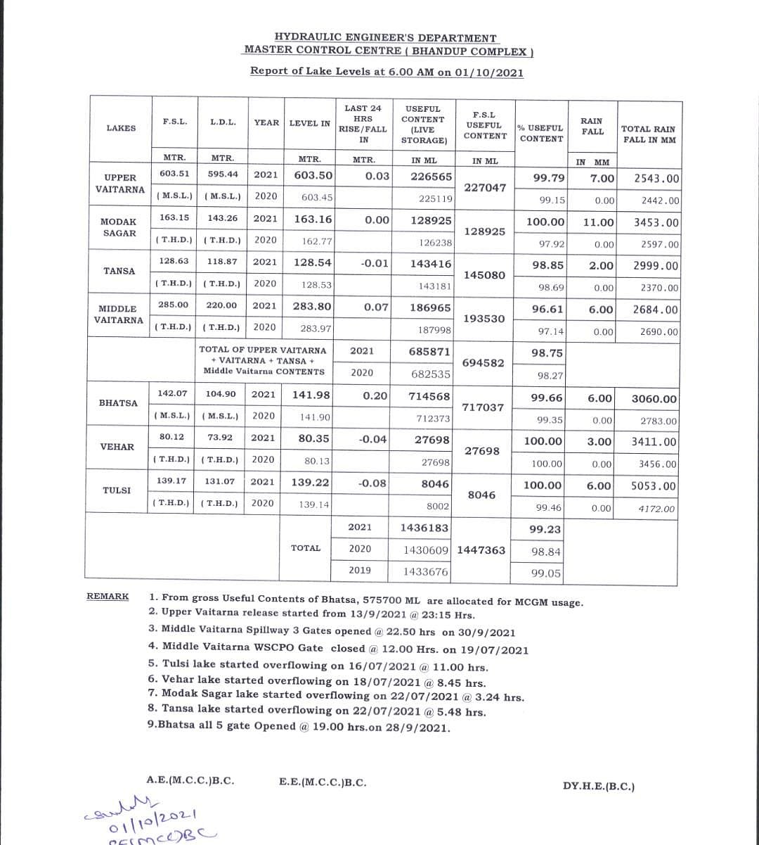 At Modak Sagar, 100 percent of water stock is available, Middle Vaitarna 96.61 percent, Upper Vaitarna has 99.79 percent, Bhatsa 99.66 percent, Vihar 100 per cent and Tulsi has 100 per cent of useful water level.