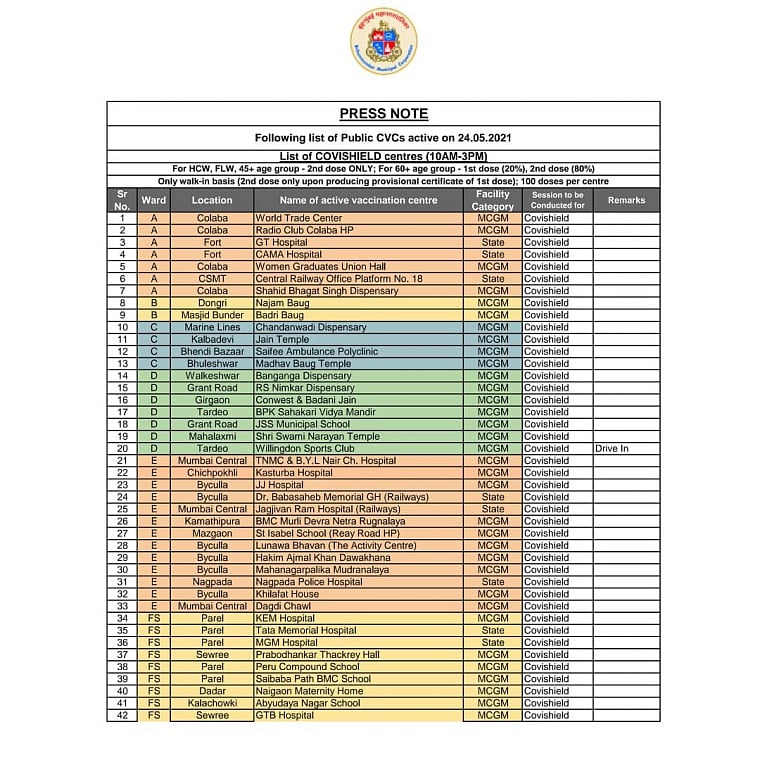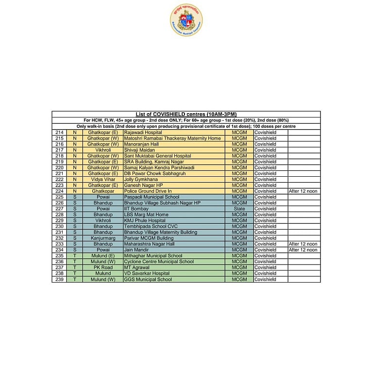 Mumbai's civic body BrihanMumbai Municipal Corporation (BMC) issued a list of COVID-19 vaccination centres available on Monday, May 24. A total of 239 centres will be administering Covishield on the basis of on the spot registration tomorrow.